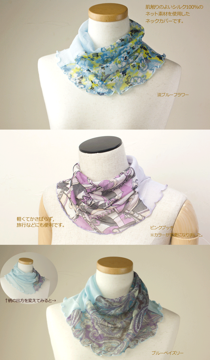紫外線対策はもちろん、夏の冷房冷え対策にも!! 【日よけ】【日焼け】【日除け】【ネックウオーマー】【ネックウォーマー】【レディース】【ネックホルダー】【チュール】【ゆうパケット送料無料】ロングタイプだから「たっぷりカバー」! シルクのメッシュ地なので、ムレずに一年中活躍します! オシャレにお肌を守るシルク・ネックカバーです。